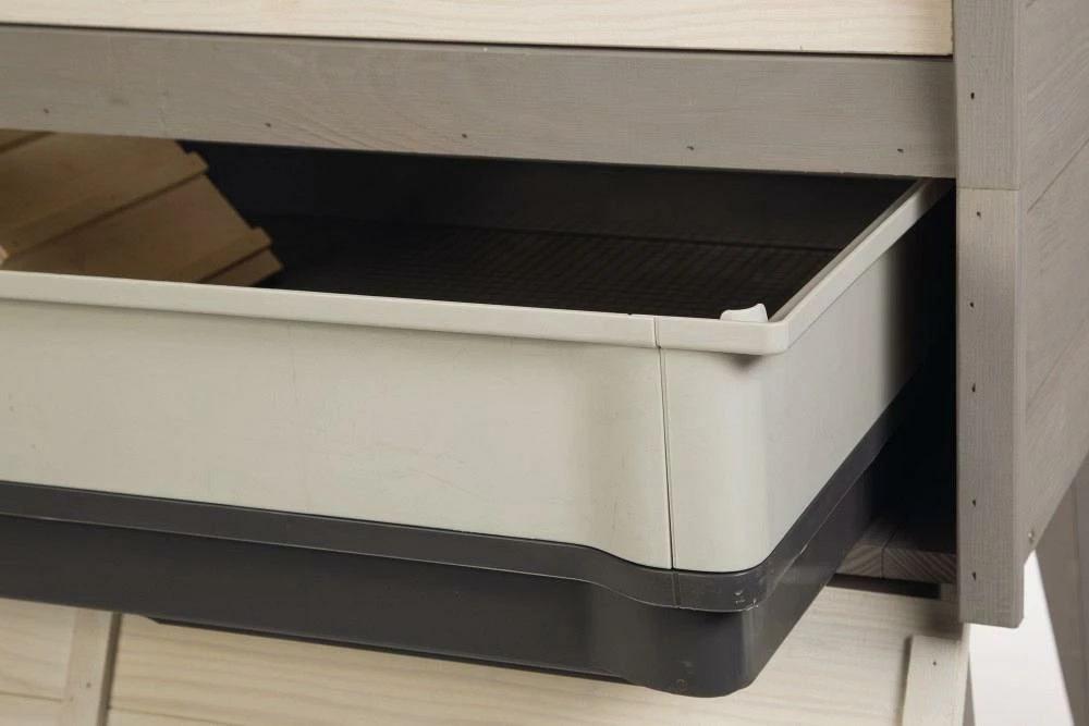 De hoog opstaande bak aan de binnenkant zorgt ervoor dat alles mooi in de kooi blijft en is eenvoudig schoon te maken. Er zijn twee trapjes te vinden in de kooi, waarvan ook een trap die tot onder de kooi gaat. Dit zorgt ervoor dat je de kooi ook uit zou kunnen breiden met een ren, om jouw konijn nog meer vrijheid te geven.