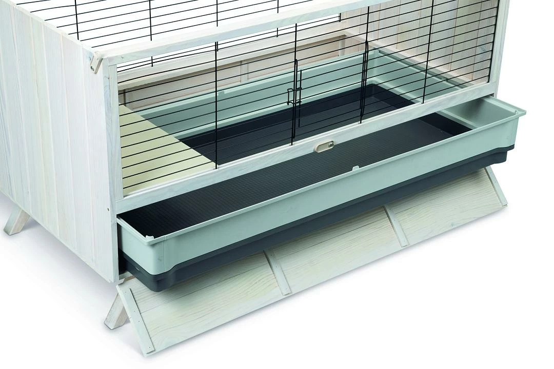 Het hok is gemaakt van duurzaam hout, is voorzien van een hoge onderbak en heeft een bodem van massief hout. De kooi is voorzien van een bovenklep die volledig open kan en die vast kan worden gezet door middel van een scharnier. Zowel de klep aan de bovenkant als de klep voor de uitschuifbare lade, kunnen vast worden gezet met een sluiting. Deze uitschuifbare lade zorgt er bovendien voor dat het schoonmaken van de konijnenkooi een stuk gemakkelijker wordt, zodat je het bijna leuk begint te vinden.