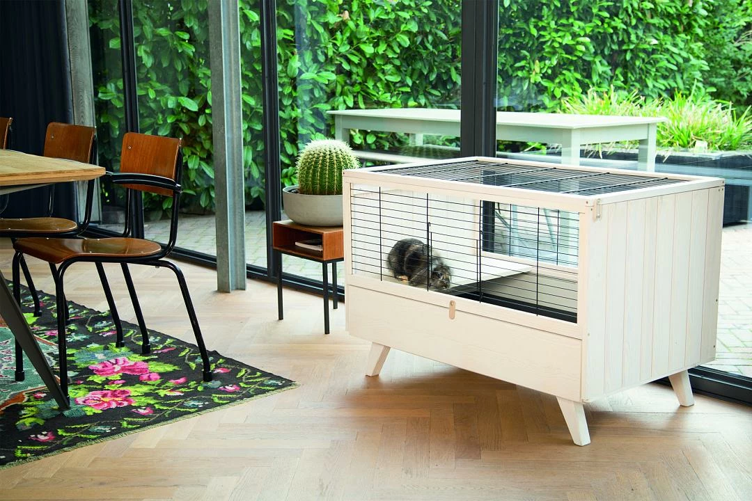 Het hok wordt geleverd inclusief vier beschermstickers voor onder de designpoten en een deurtje met vergrendeling aan de voorkant, dat jouw konijn niet zelf open kan maken.