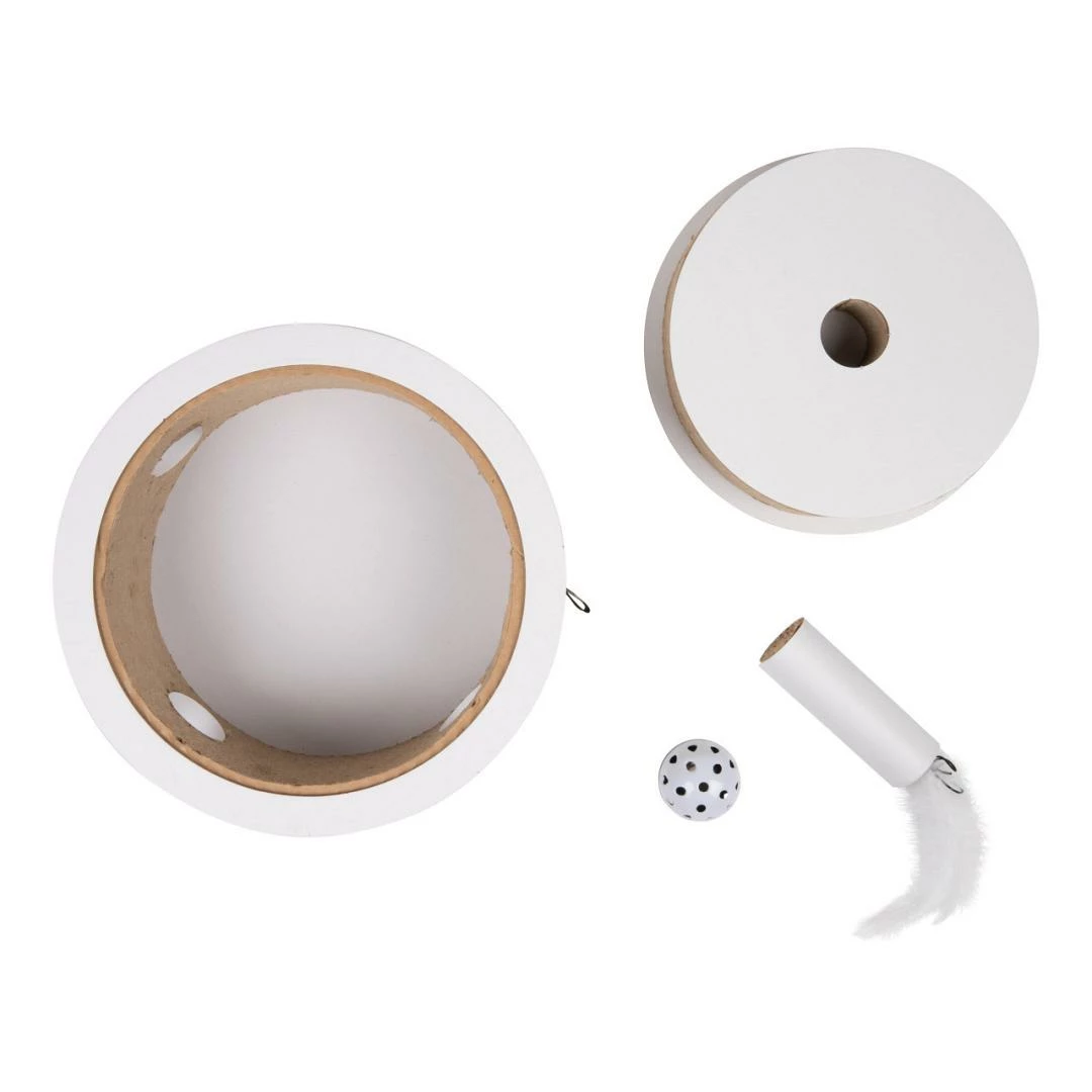 Stijlvol krabspeelgoed van duurzaam golfkarton. Bestaat uit drie lagen en heeft een balletje met rinkelende belletjes in de onderste laag.