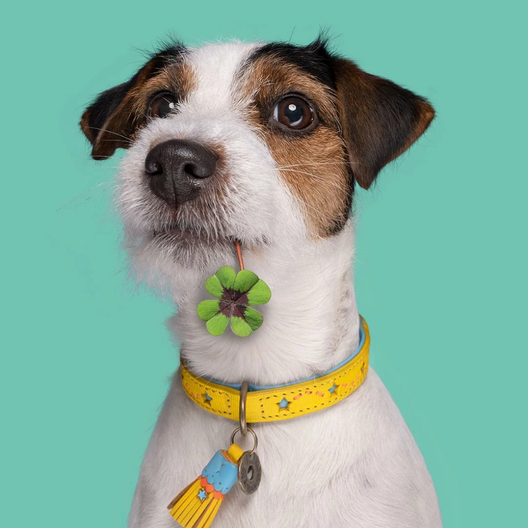 De fantastische Dog with a Mission halsband Blue Star is een gele halsband met zes blauwe sterren. De oranje stiksels en de hagedissenprint maken deze halsband helemaal af.
