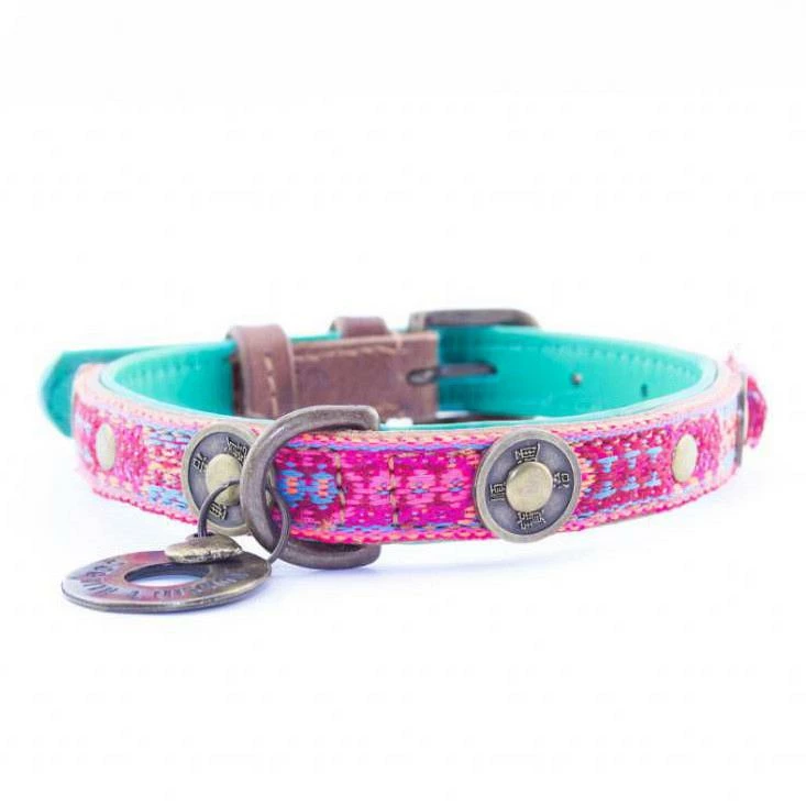 Dog with a Mission Halsband Boho Rosa is handgemaakt, geborduurd en gestikt. De combinatie van bruin leer met roze gestikte versiering maakt deze band voor elke hond geschikt!