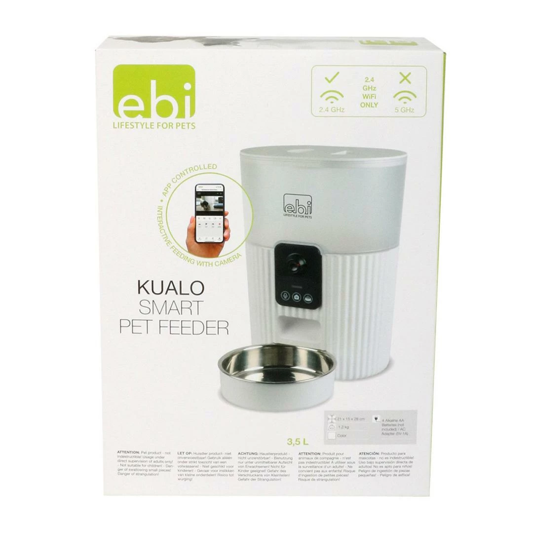 Smart feeder Kualo met camera is een voersysteem, bedienbaar via een app van EBI voor honden en katten. Ideaal als je onverwacht een paar uur moet overwerken en je huisdier gewend is om op een vast moment eten te krijgen.