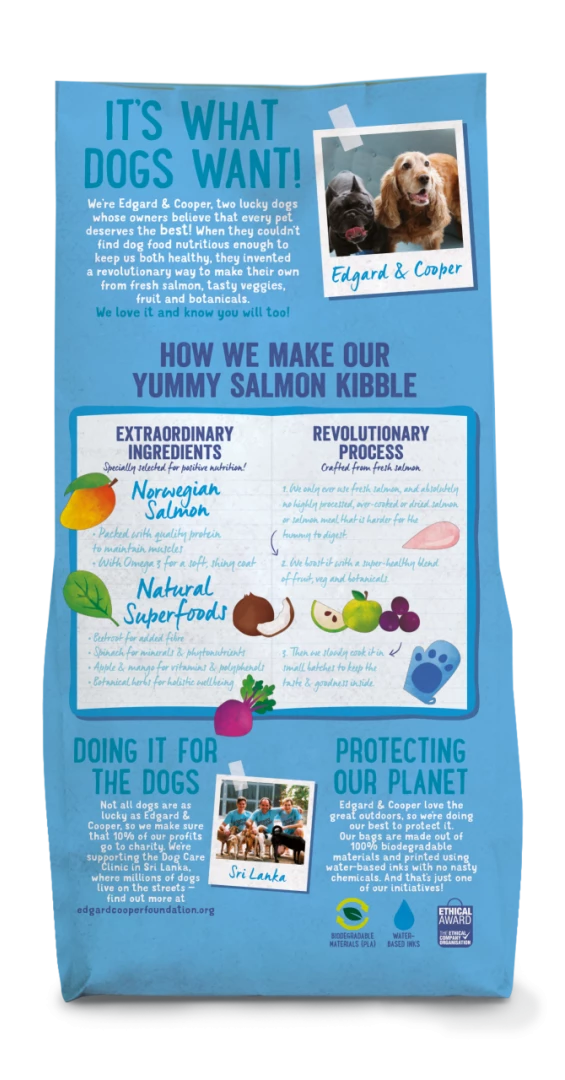 In Edgard & Cooper hondenvoer Adult Noorse zalm wordt enkel verse Noorse zalm gebruikt en absoluut geen bewerkte, overgare of gedroogde zalm of zalmmeel dat moeilijker is voor de buikjes om te verteren. Daarnaast wordt er een supergezonde mix van fruit, groenten en kruiden toegevoegd.