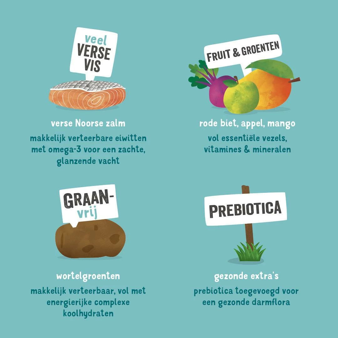 Hypoallergeen en graanvrij hondenvoer met verse Noorse zalm voor volwassen honden.