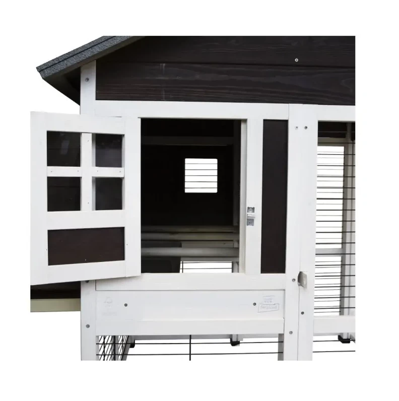 Het kippenhok staat op stevige plastic poten en is van binnen verdeeld in twee aparte ruimtes. De eerste ruimte is een hut voor het verzamelen van eieren, uitgerust met een zijdeur die open kan met veiligheidsslot. De tweede ruimte bestaat uit een groter gebied compleet met zitstok, vuilopvangbak en metalen rooster, dat helpt het binnenmilieu schoon te houden door te voorkomen dat vogels in contact komen met vuil. Een handige houten ladder zorgt ervoor dat de kippen gemakkelijk op- en af kunnen stappen de grote ren in. De toegangsdeur is verschuifbaar.
