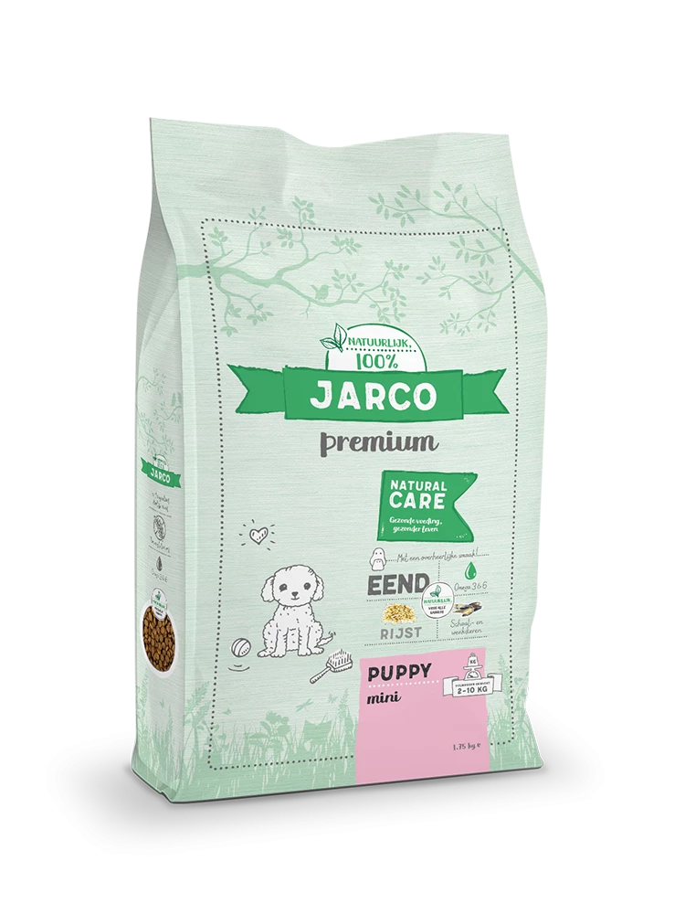 Jarco Natural Mini Puppy op basis van eend is een hoogwaardige, natuurlijke en gezonde voeding zonder chemische antioxidanten, geur-, kleur- en smaakstoffen.