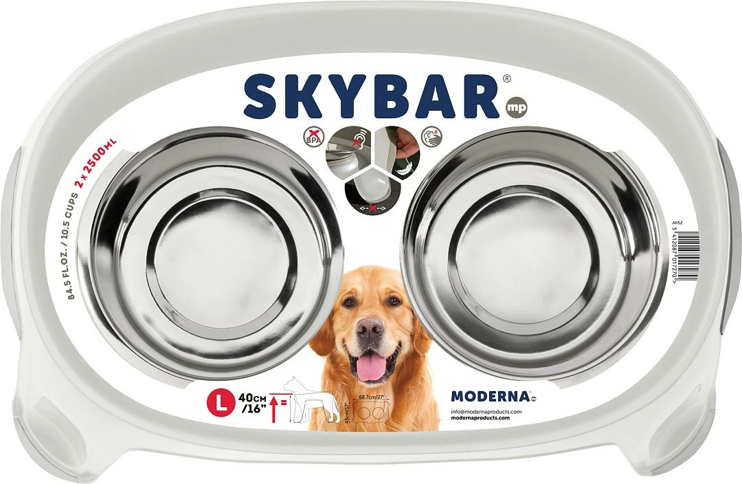 De Moderna dubbele voederstandaard Skybar helpt jouw hond comfortabel te eten en drinken. Voorzien van antislip onderaan de poten tegen het wegglijden, aan de zijkanten voor goede houvast tijdens het verplaatsten en rondom de RVS eetbakken, zodat deze geen geluid produceren tijdens het eten of drinken.