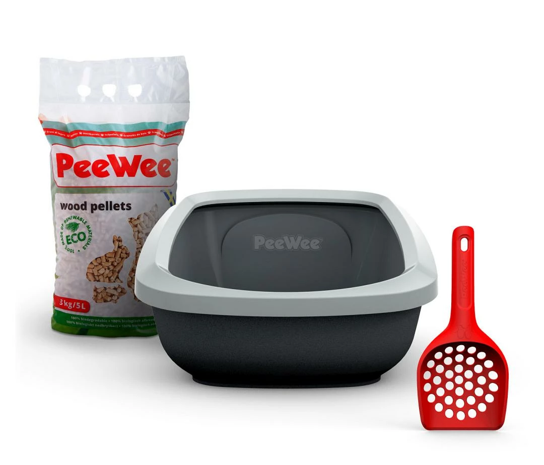 Het PeeWee kattenbak Startpakket EcoGranda bestaat uit de PeeWee Kattenbak EcoGranda, de PeeWee kattenbakvulling Houtkorrels 3 kg en een PeeWee Kattenbakschepje.