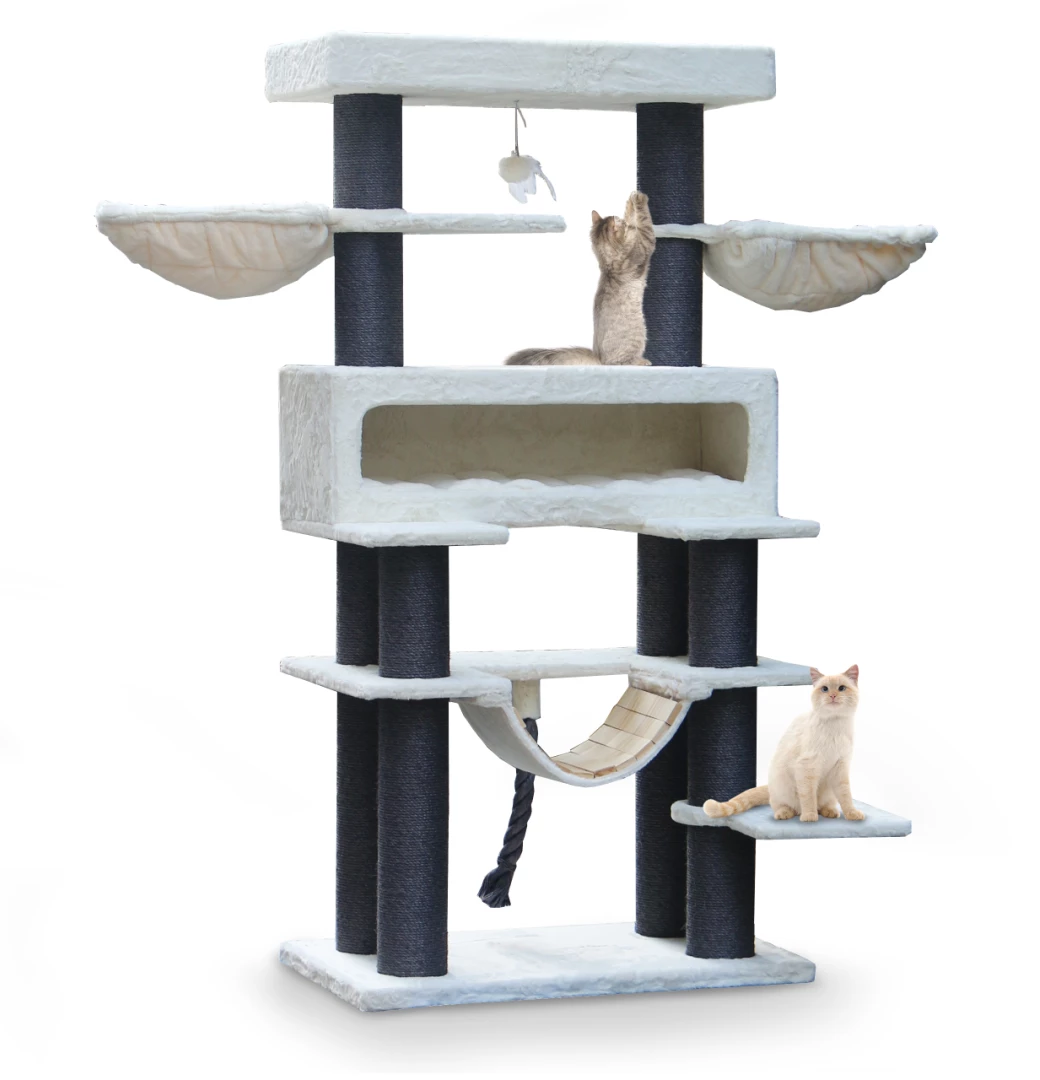 Petrebels Krabmeubel Lucky Bastards Lookout 198 is een moderne krabpaal met een robuuste look. Avontuurlijke katten kunnen hun hart ophalen, want hierin kan werkelijk waar alles! Krabben aan de extra dikke krabstammen van 15 centimeter dik, tijgeren over de houten brug en uitgestrekt slapen in de mega lounge of een van de twee luxe hangmatten. En de XL-loungemand bovenin is speciaal voor katten die graag hoog zitten of liggen. Heerlijk om in te snurken, maar natuurlijk ook om te kijken of de visite wel te vertrouwen is.