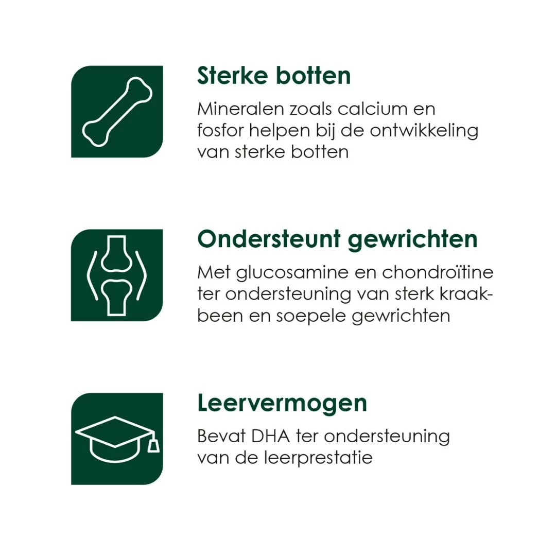 | Ondersteunt gewrichten Met glucosamine en chondroïtine ter ondersteuning van sterk kraakbeen en soepele gewrichten. | |