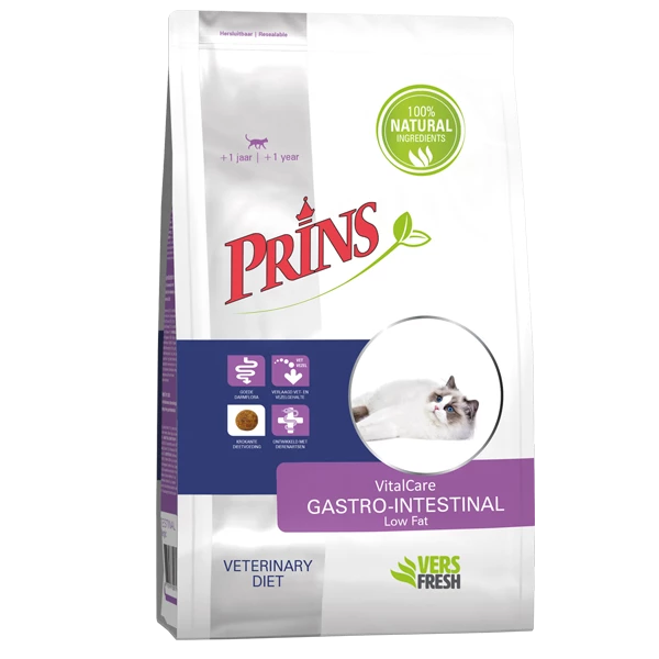 Prins VitalCare Veterinary Diet Gastro-Intestinal Low Fat is speciaal geschikt voor volwassen katten ter compensatie voor een slechte spijsvertering. Ook geschikt bij acute diarree of tijdens de daaropvolgende herstelperiode.