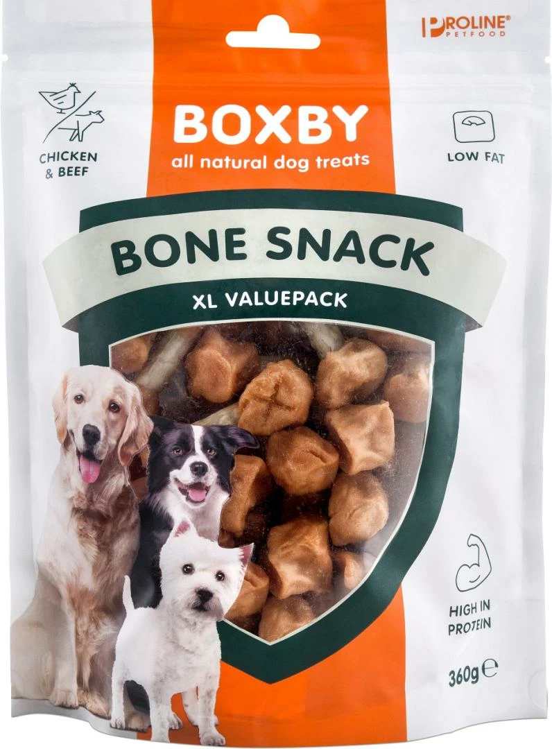 Proline Boxby Bone Snack is een eiwitrijke hondensnack met een krokant laagje. De snacks bevatten een laag vetgehalte en zijn glutenvrij.