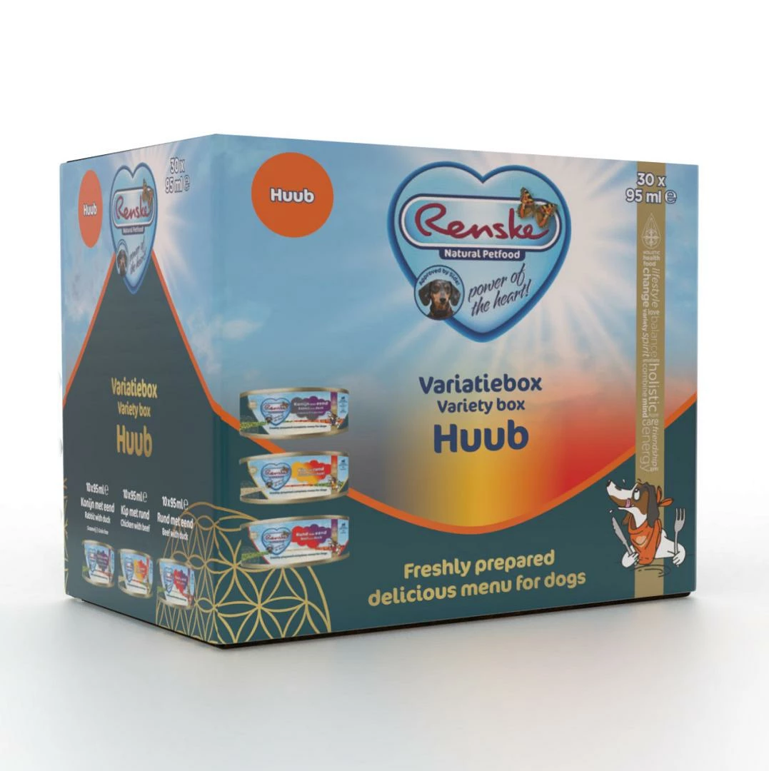 De Renske Hondenvoer Variatiebox Huub Graanvrij is een handige variatieverpakking met drie heerlijke varianten Renske Vers Bereid 95 gr!