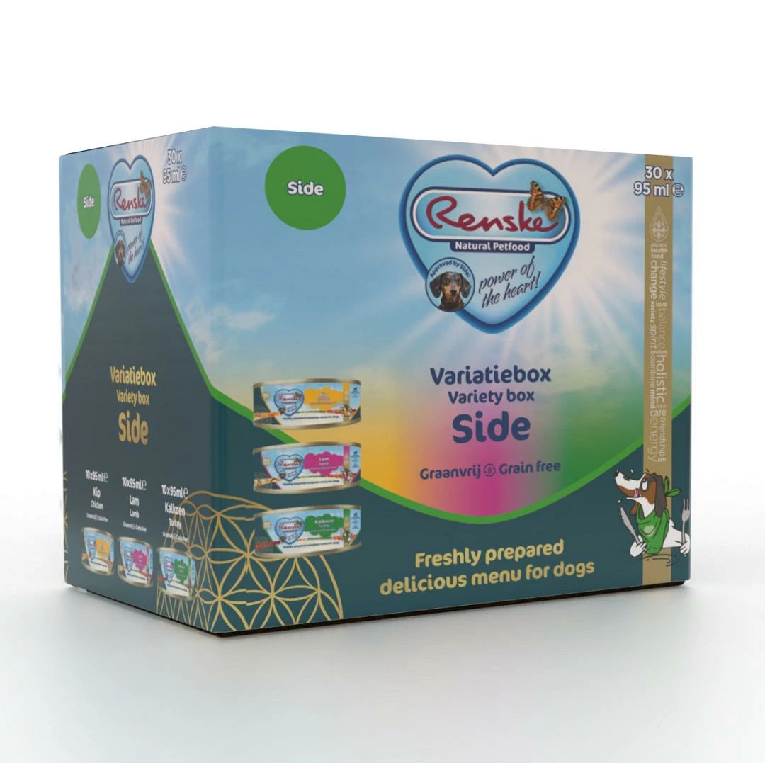 De Renske Hondenvoer Variatiebox Side Graanvrij is een handige variatieverpakking met drie heerlijke varianten Renske Vers Bereid 95 gr!