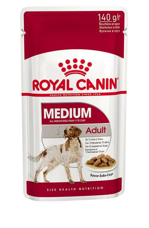 Royal Canin Medium Adult Wet hondenvoer is een volledige natvoeding voor volwassen honden, van 12 maanden tot 10 jaar oud, van middelgrote hondenrassen met een gewicht van 10 tot 25 kg.