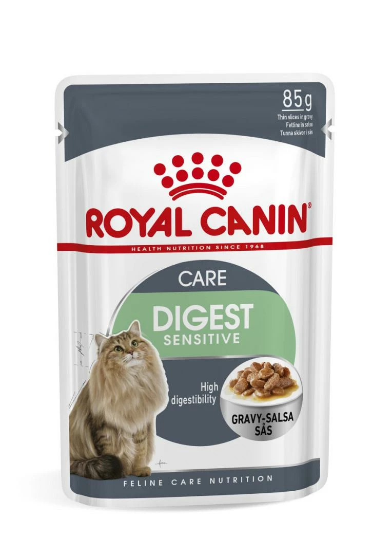 Royal Canin Digest Sensitive in gravy zijn maaltijdzakjes met vleesbrokjes in saus voor katten vanaf 1 jaar met extra aandacht voor de spijsvertering.